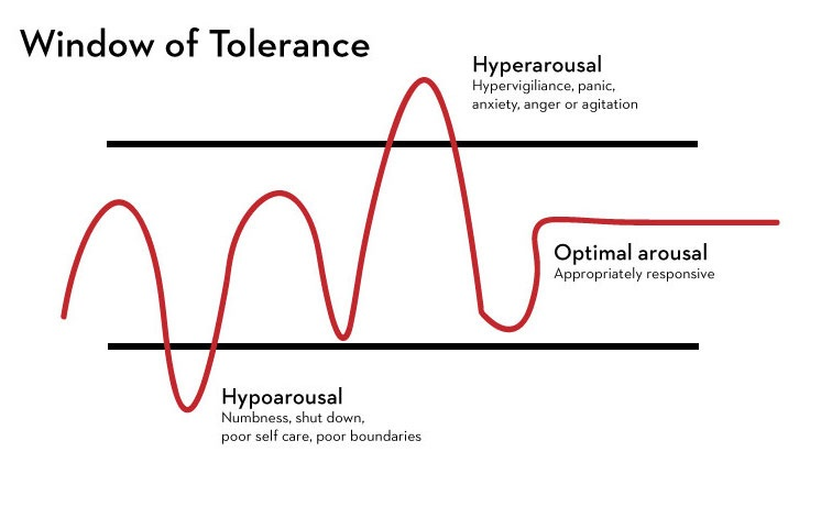 La finestra di tolleranza è un costrutto che rappresenta un intervallo di attivazione fisiologica in cui il cervello e il corpo possono funzionare al meglio. Quando una persona è all’interno di questa finestra, è in grado di affrontare le sfide e le emozioni senza essere sopraffatta o troppo sottoattivata. Tuttavia, se una persona va al di fuori dei margini dati da questa finestra, può sperimentare una reazione di “iperattivazione” (troppo stress) o “ipoattivazione” (apatia e disconnessione). (Siegel, 2001)
